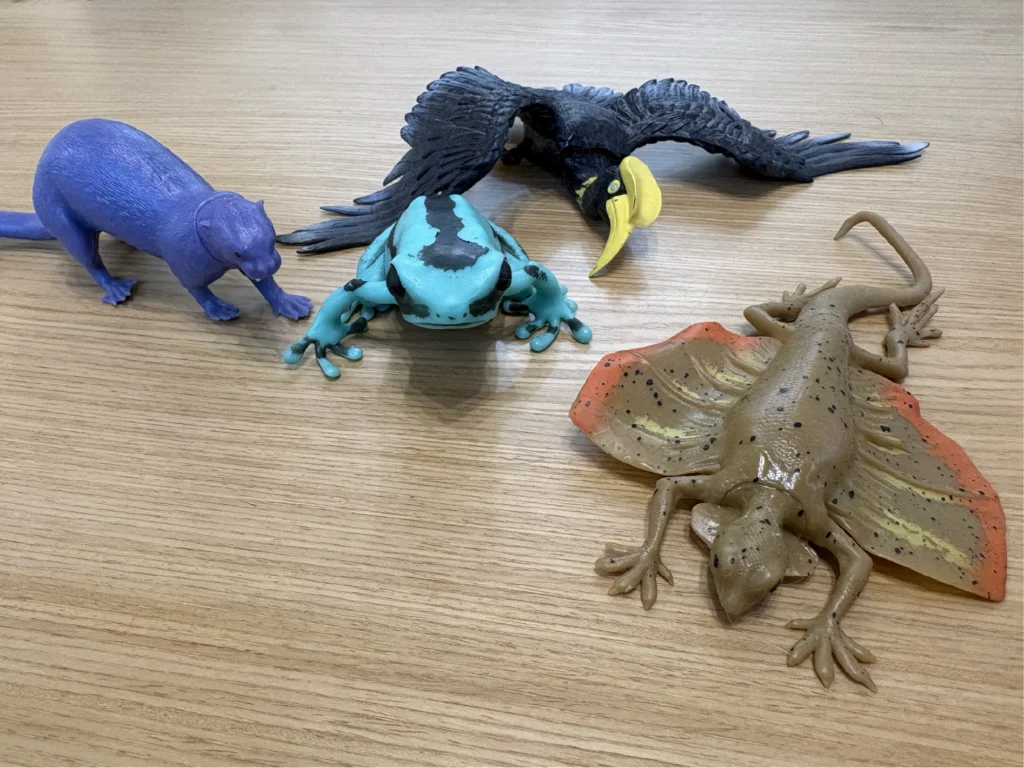ですが、ジャワトビトカゲやオオサイチョウなど羽や細長いしっぽは折りたたまれて入っているため、袋の上からさわった感じは丸っこくなっています。